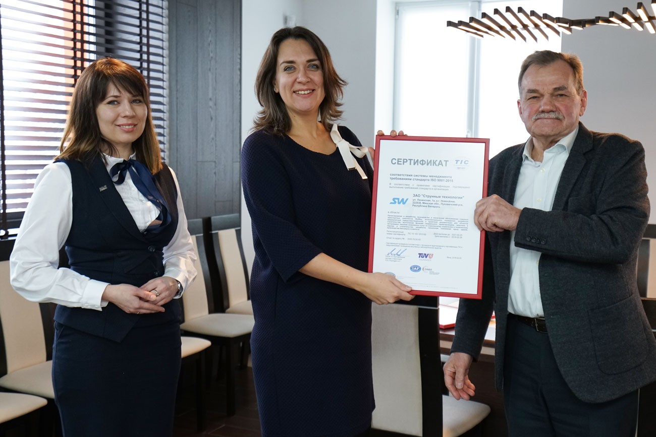 Certificates of conformity were hand-delivered to the General Director of SkyWay Technologies Co. by Marina Khondral, Director of the Belarusian representative office of the certification Agency “TÜV Thüringen” and Nikolay Kusakin, senior auditor of the Corporation “TÜV Thüringen”.