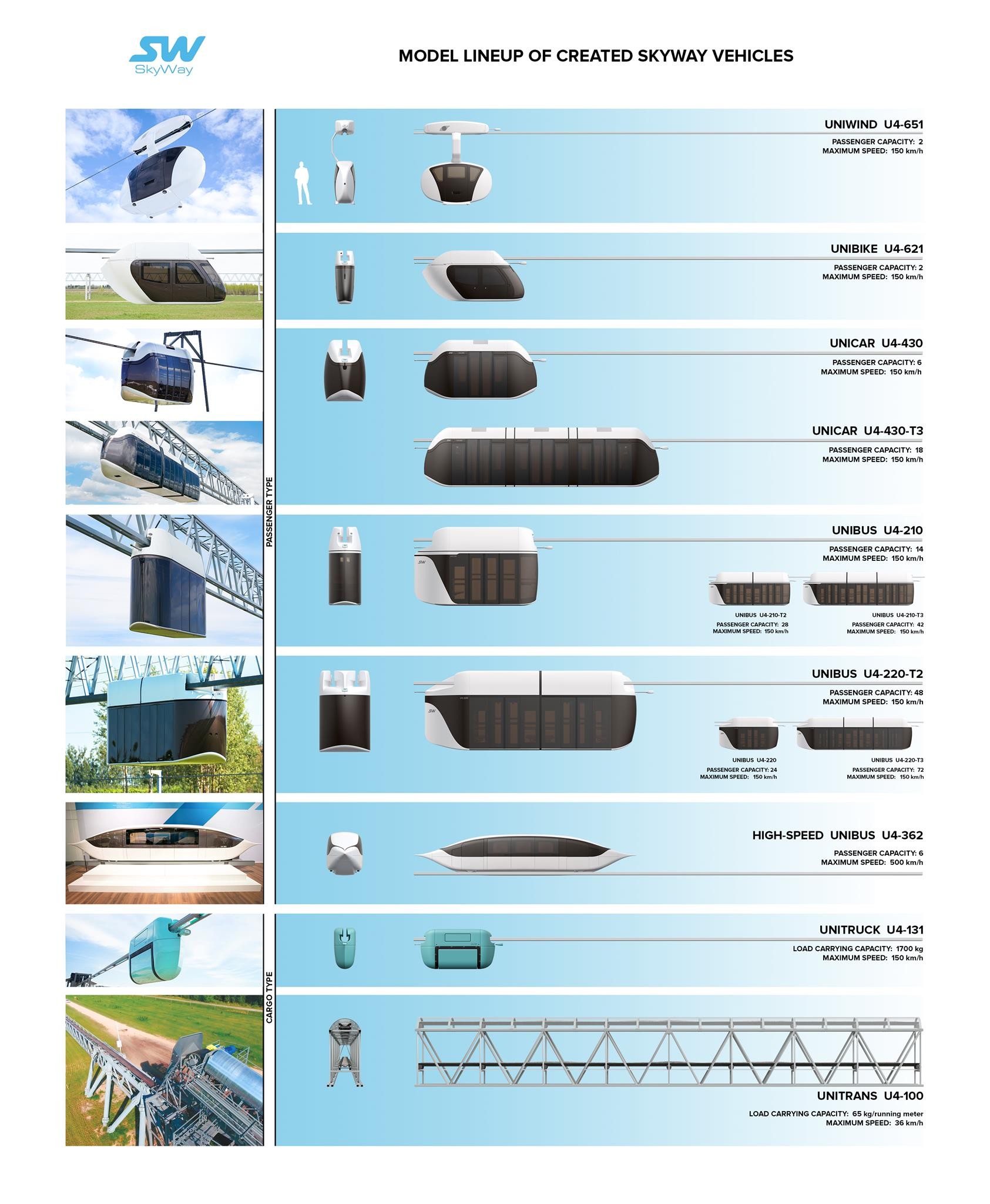 For the time being, experts of SkyWay Technologies Co. have developed and produced nine models of rolling stock designed to perform a variety of functions. In total, there are seven passenger pods and two cargo vehicles in SkyWay model lineup that are ready for serial production and market entry.