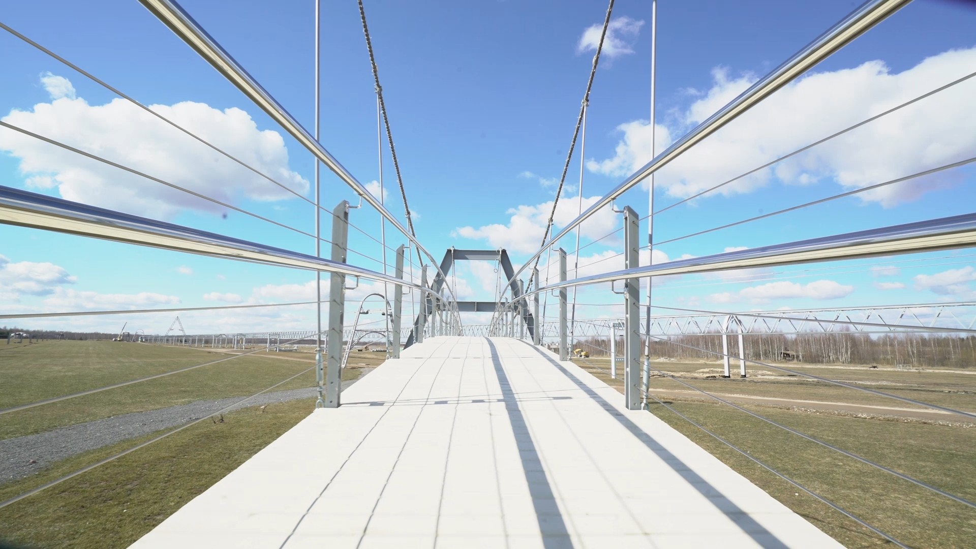 “Exhibition sample of string overpass” is the mean technical name of the string bridge, well known to all guests of EcoFest 2018. Today we will tell more about this structure to those who missed that event. This is a transport system designed to demonstrate alternative applications of string communication systems and tests with components of a string overpass using a coiled tubing pipe as the main carrier element. It is located not far from the guest house onsite of SkyWay EcoTechnoPark as a span structure made of metal parts with two anchor points at the edges and two intermediate supports. The span of intermediate supports is 10/30/10 m.