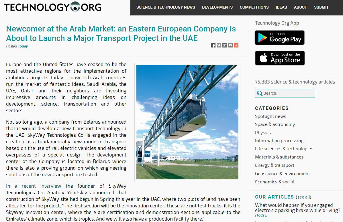 “Not so long ago, a company from Belarus announced that it would develop a new transport technology in the UAE. SkyWay Technologies Co. is engaged in the creation of a fundamentally new mode of transport based on the use of rail electric vehicles and elevated overpasses of a special design. The development center of the Company is located in Belarus where there is also a proving ground on which engineering solutions of the new transport are tested”, The Technology Org website writes on his page. The portal publishes information about various science and technology topics.