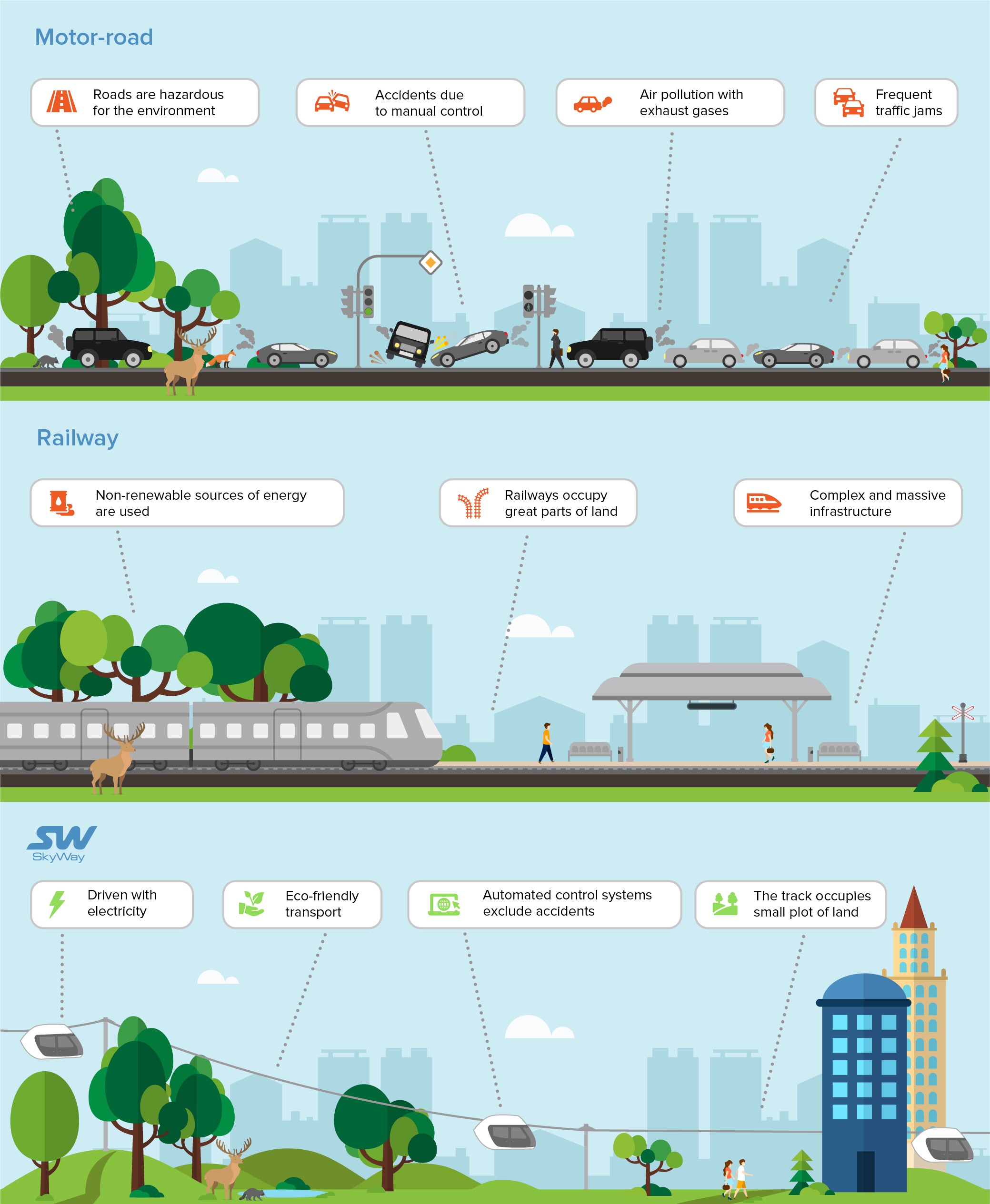 These ideas duplicate the essence of Skyway transport: the need to merge various solutions to create a universal transport for all types of transported objects at all possible areas. SkyWay General designer Anatoly Yunitskiy has promoted this visionary idea for many years.