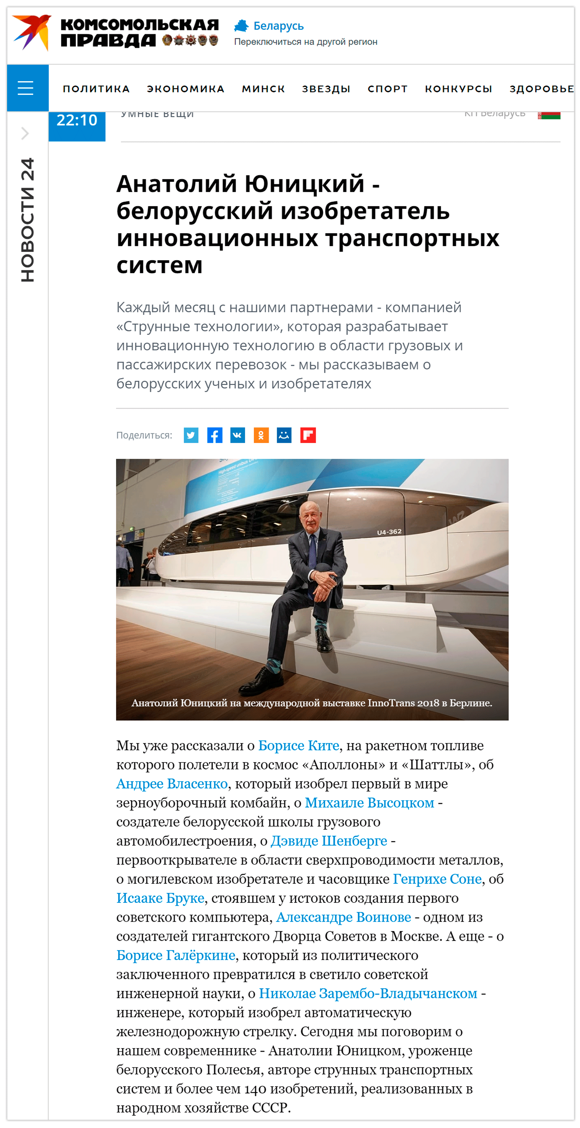 With the support of Unitsky String Technologies Co., newspaper "Komsomolskaya Pravda" introduced to its readers during the year the biographies of outstanding Belarusian scientists, inventors and engineers who have made a significant contribution to the development of science and technology. These people left their mark not only in the Belarusian but also in the world history.