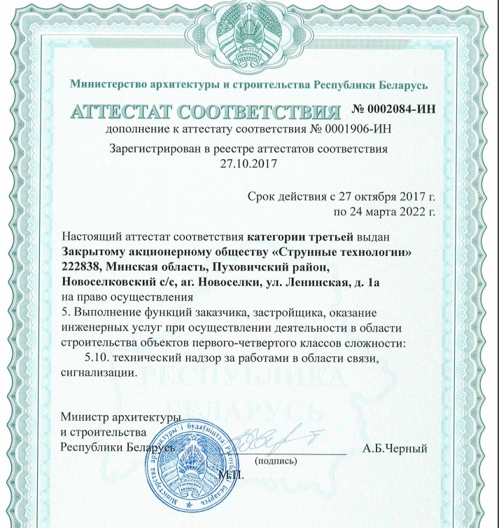 Министерство архитектуры и строительства Беларуси выдало проектной организации SkyWay ЗАО «Струнные технологии» аттестат соответствия третьей категории № 0002084 на право выполнения функций заказчика, застройщика, оказание инженерных услуг при осуществлении деятельности в области строительства объектов первого-четвертого классов сложности и право технического надзора за работами в области связи и сигнализации.