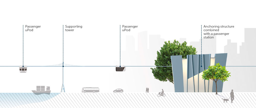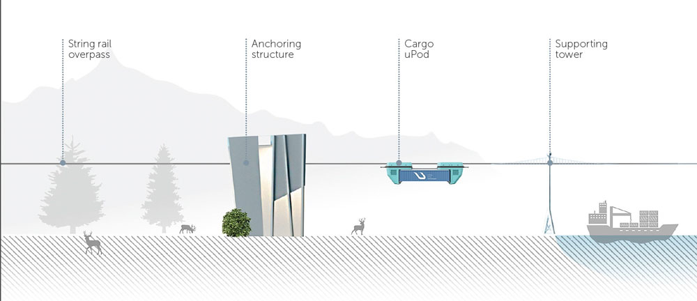 This diagram shows the organic integration of infrastructure and ecology. Environmental impact is minimized through the implementation of electric passenger uPods and compact station designs